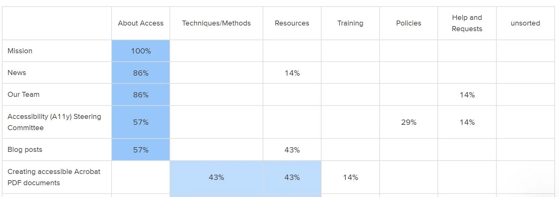 The results below show the percentage of participants who sorted each card into the provided categories, (which were derived from the current site) highlighting the most popular choices.