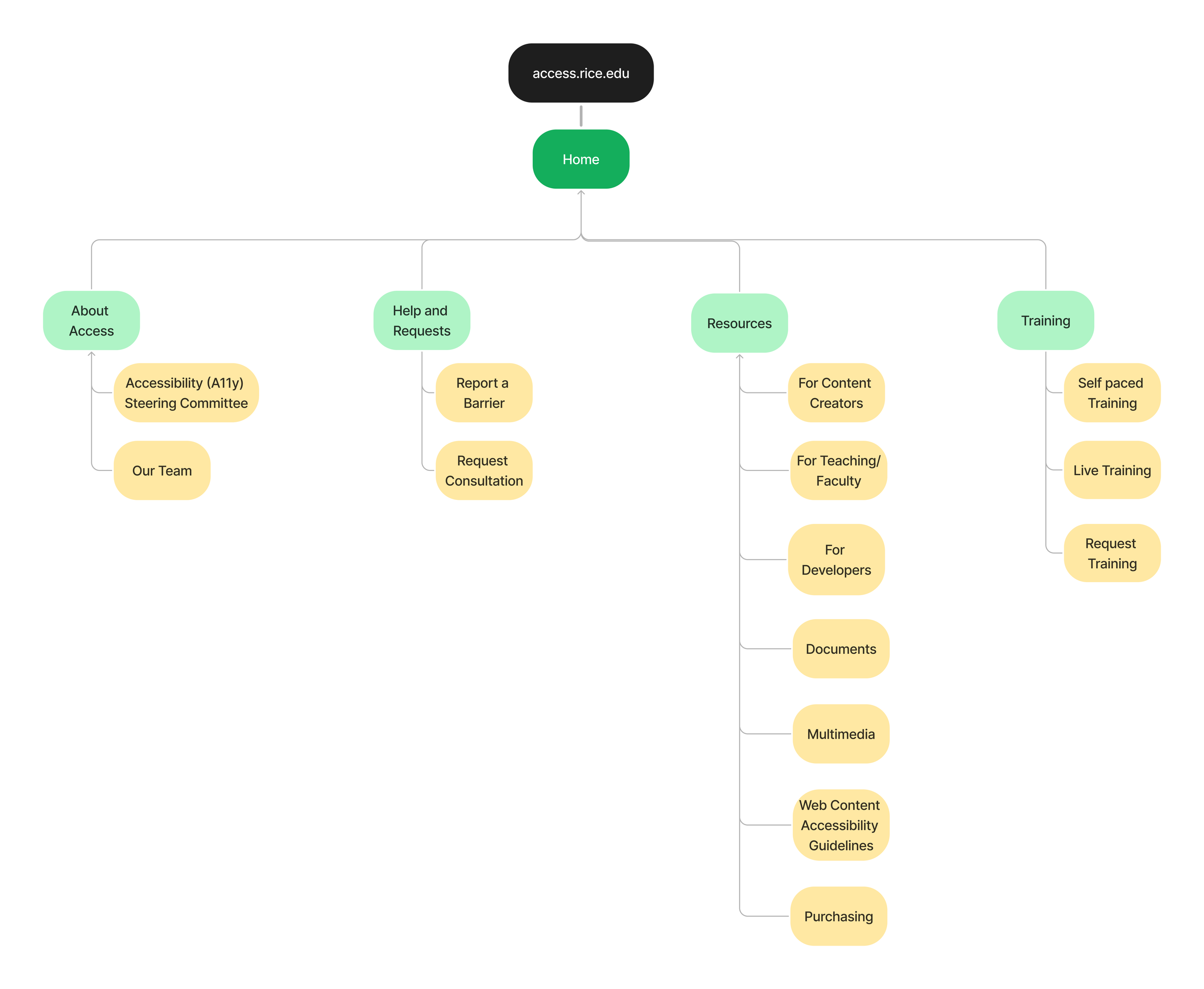 Before beginning any design work, I familiarized myself with the site. I then had a project kick-off call with the Digital Accessibility Coordinator, with whom I would be working closely. During this call, we discussed the site's users, its purpose, and any existing concerns or issues that needed attention. After learning that the site would primarily serve Rice users for browsing guides and reporting issues, I decided to conduct a closed card sort exercise to gauge how well users would be able to navigate on the site given the current site structure.