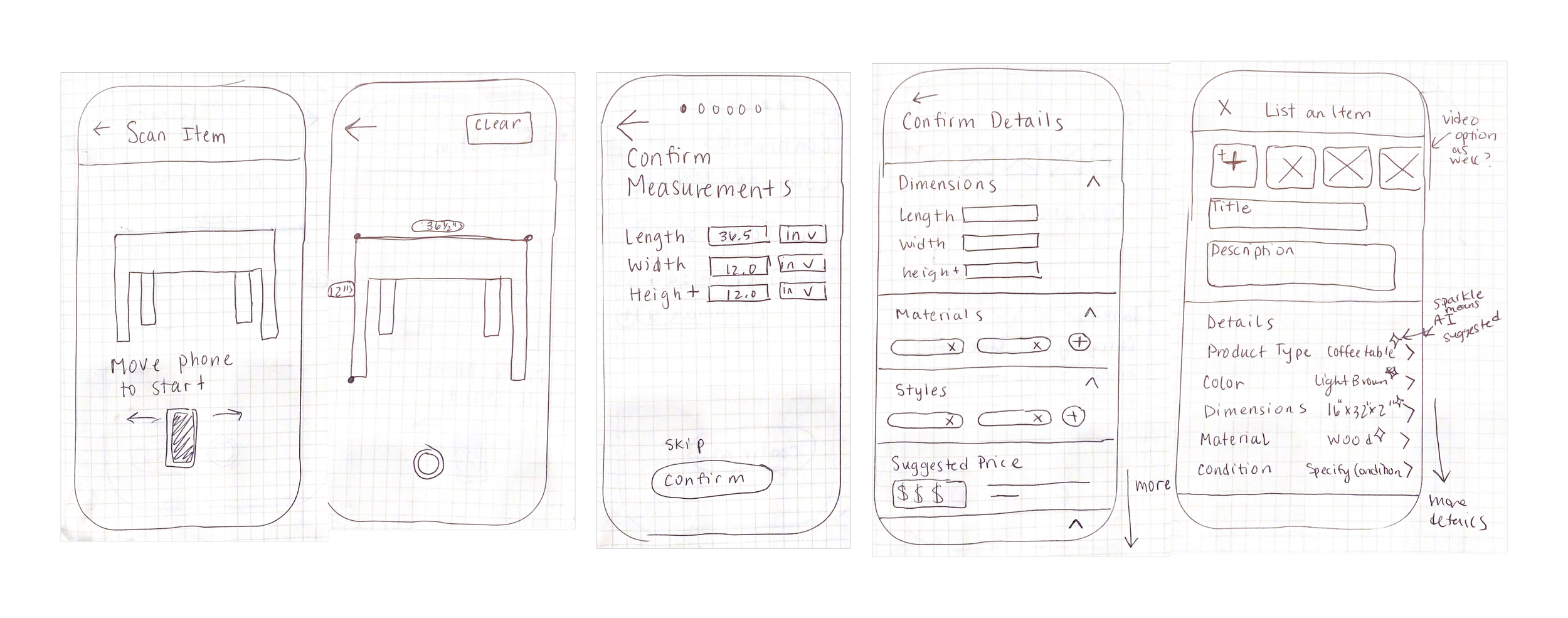 These screens were sketched for the process to upload an item using AR. For the inspiration, I looked upon apps which use AR such as Apple’s measure app, Target’s shopping app, and an even online eyeglass store that allows you to try on glasses!