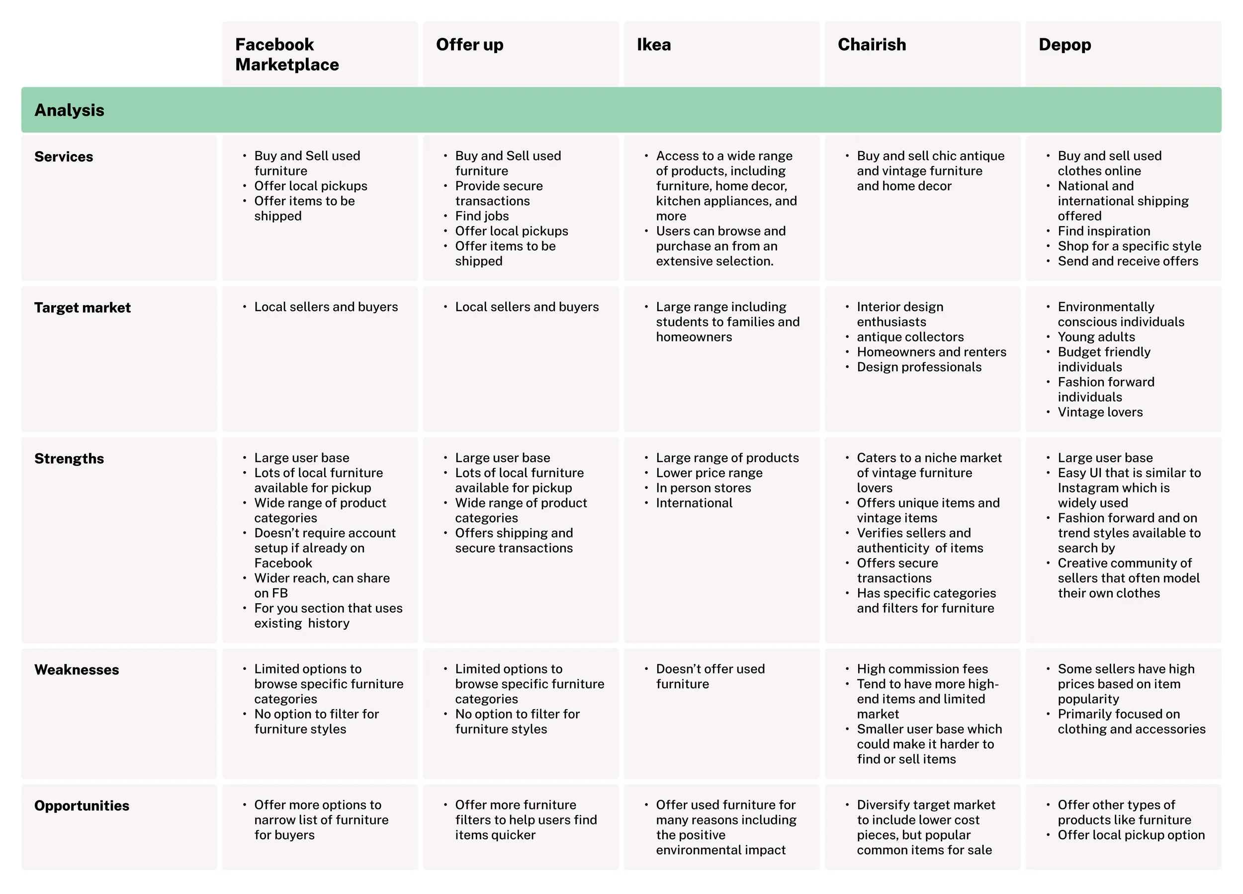 I conducted a competitive analysis to analyze 5 apps currently on the market that offer furniture resale and other resale services. I completed a SWOT analysis along with a comparison of the features to gauge what the current market offers.