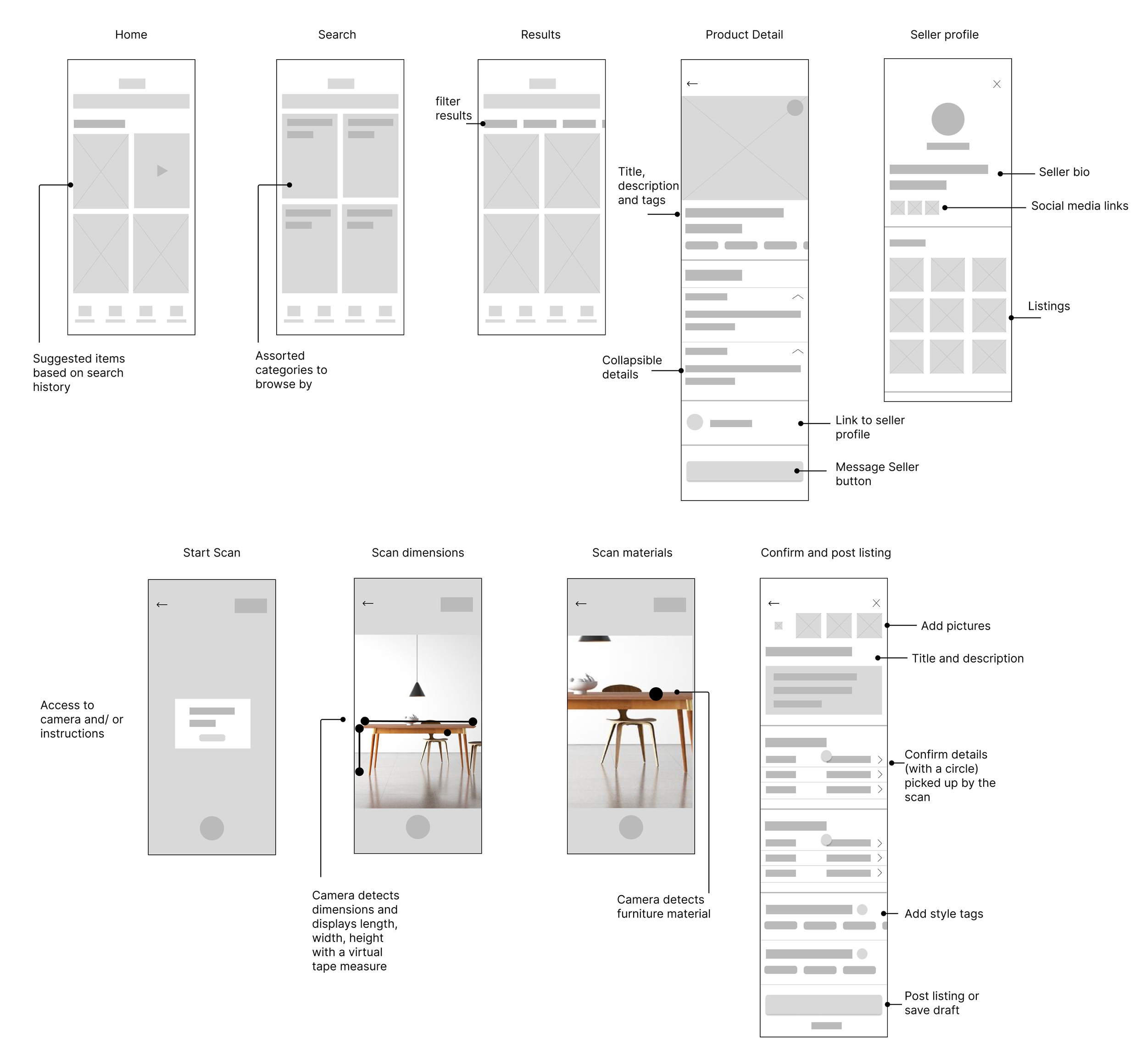 I sketched some screens that promote exploring but also allows a user to find something specific, and a detailed product listing page so users have the information they need regarding a piece of furniture.