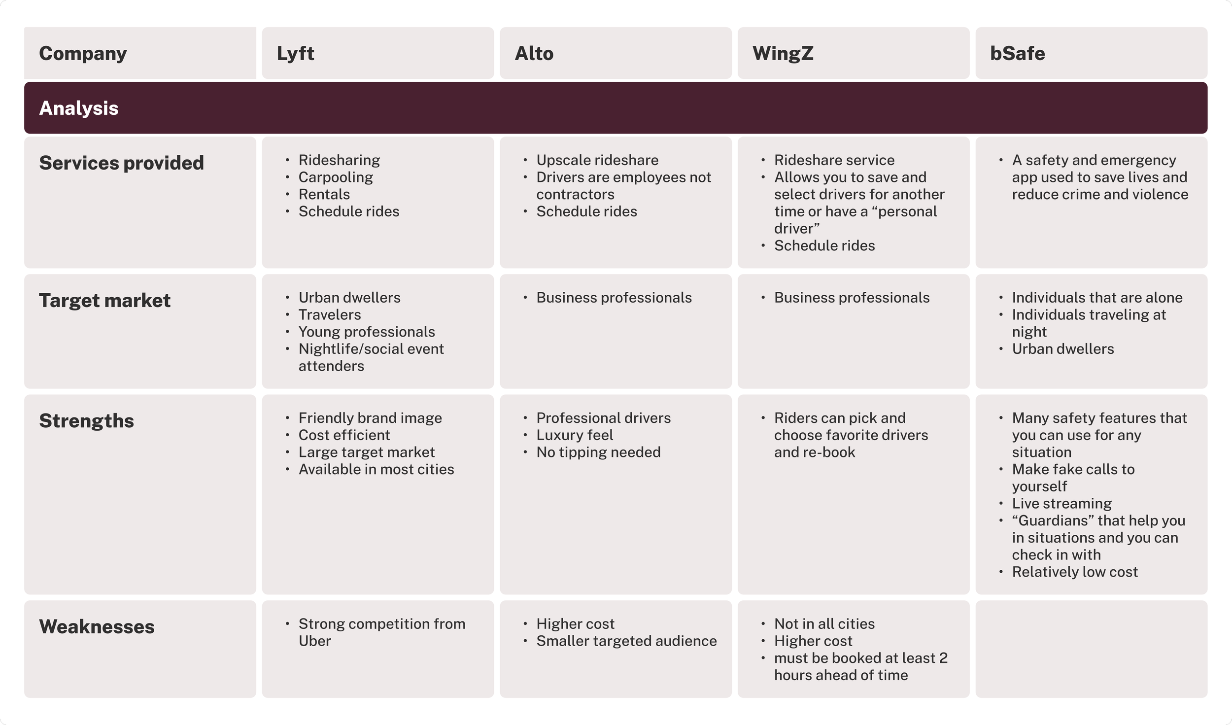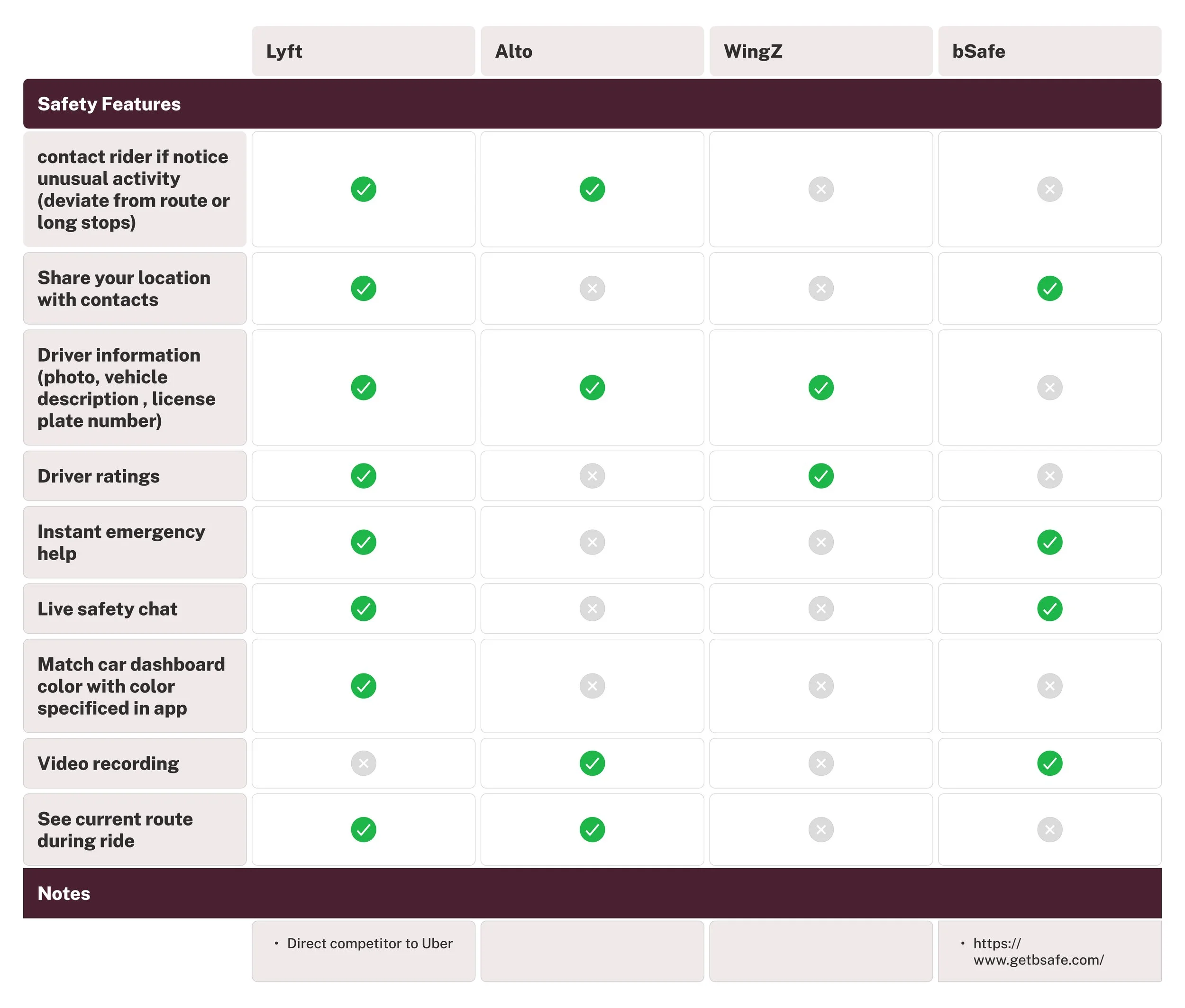 Some key takeaways from my competitive analysis was that Lyft was very similar in safety features compared to Uber and the most accessible and affordable. Another indirect competitor, bSafe, provides many additional safety features that did not exist in any other rideshare apps, that could potentially be used on an Uber ride.