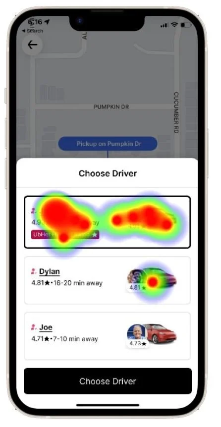 By looking at the heatmap to see all clicks from usability testers, I saw participants were clicking the driver card instead of just their name. I increased the clickable area to access the driver profile screen to improve this rating.